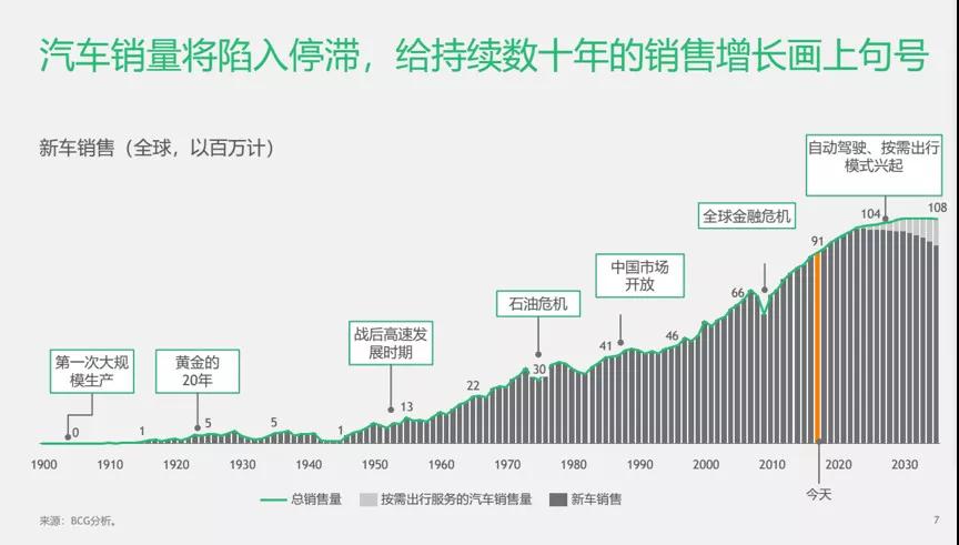 預測,在2025年之前新車銷售還將繼續大幅增長,主要是受中國和其他發展中市場的推動。但是在此之后,隨著中國銷量的增速減緩以及共享無人駕駛電動汽車的普及加快,汽車銷量將陷入停滯,給持續數十年的銷量增長畫上句號。