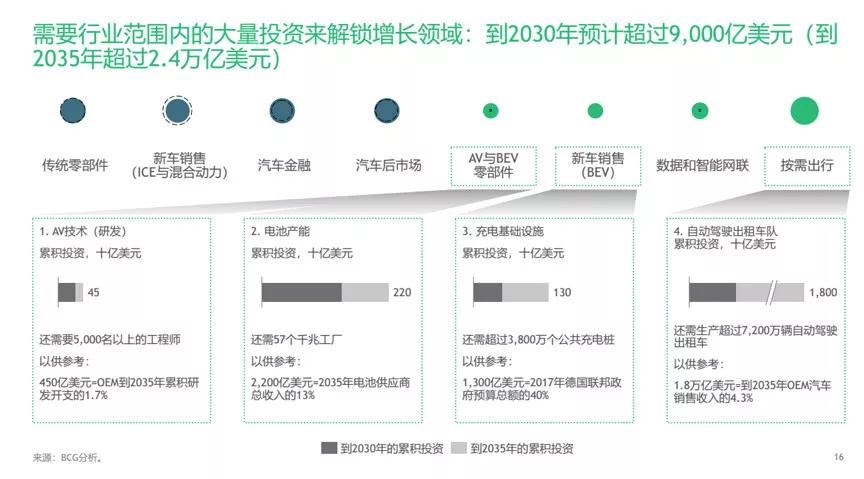 據BCG預測,為挖掘出行技術的潛在價值,行業參與者到2030年將需在新增長領域投入超過9000億美元,到2035年則要超過2.4萬億美元,重點投資領域包括自動駕駛汽車技術、電池生產設施、充電基礎設施和自動駕駛出租車隊。
